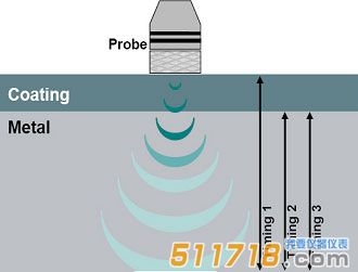 發射的超聲波脈沖穿過涂層與金屬并從底部反射。反射回波在金屬中往復反射,每次只有一小部分回波穿過涂層返回。兩個小回波之間的時間即是聲波在金屬中的傳播時間,與金屬厚度相對應。回波不需要是連續的,儀器可以自動判斷回波并計算出厚度值。每次確認很小的三個回波,即自動測量驗證系統(AMVS)。